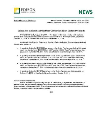 ROSEMEAD, Calif., August 28, 2014 — The Board of Directors of Edison International (NYSE: EIX) today declared a quarterly common stock dividend of $0.355 per share, payable on October 31, 2014, to shareholders of record on September 30, 2014.