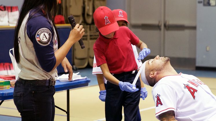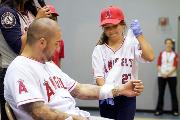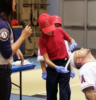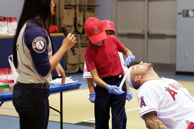 Hector Santiago, a pitcher for the Los Angeles Angels of Anaheim, was hit by a pitch and suffered a head wound. Luckily for him, it was just a simulation and Ruby, a 9-year-old student at Melrose Elementary School in Placentia, California, helped bandage and care for his fake wound.
