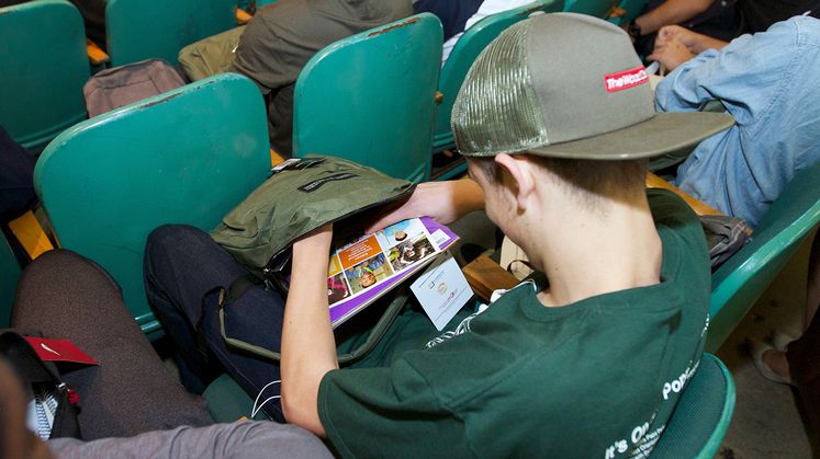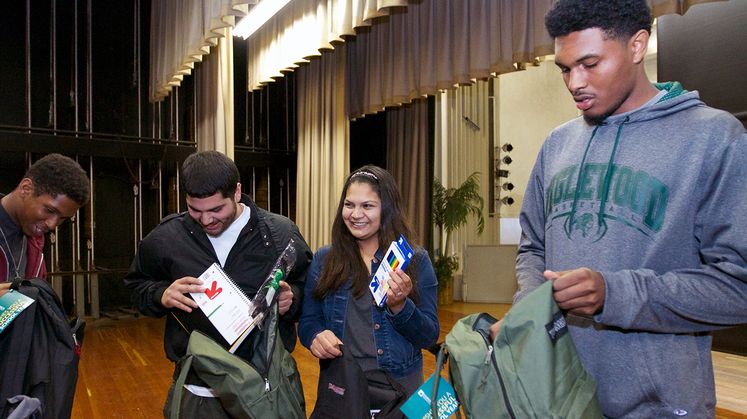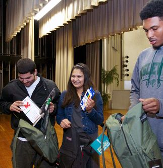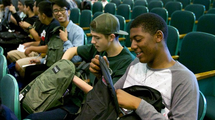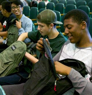 During a recent assembly at Inglewood High School, Ashley Acosta and Kameron Squalls, both 17, sat side-by-side inspecting the contents of their new backpacks during a surprise giveaway to all seniors in the school auditorium.