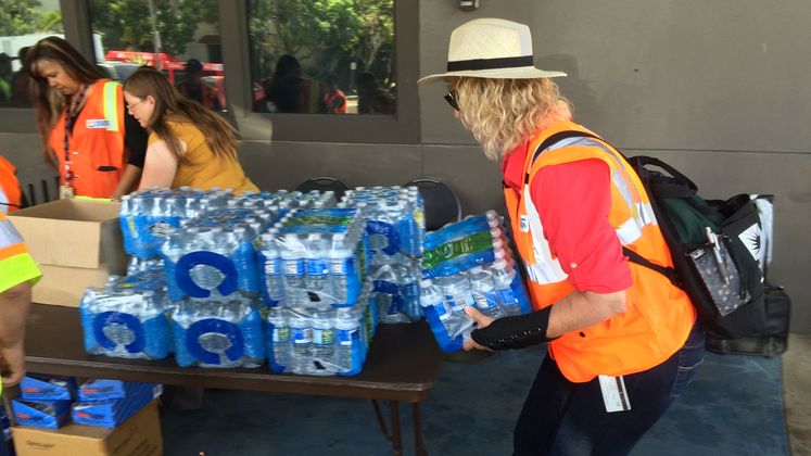 At Cesar Chavez Park in Long Beach Friday, residents impacted by the outage came by car, by foot and some by bicycle. They came for the bottled water, ice and flashlights being distributed by SCE workers.