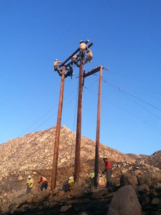 Planners worked to get permission to fly in the area, which was restricted for firefighting efforts. SCE crews started early Saturday morning to dig four six-foot holes in the rugged, rocky soil so poles could be set into them once they were flown in. That afternoon, poles were lifted from the base camp by helicopter to the remote site and crews began placing them and energizing the system, section by section.
